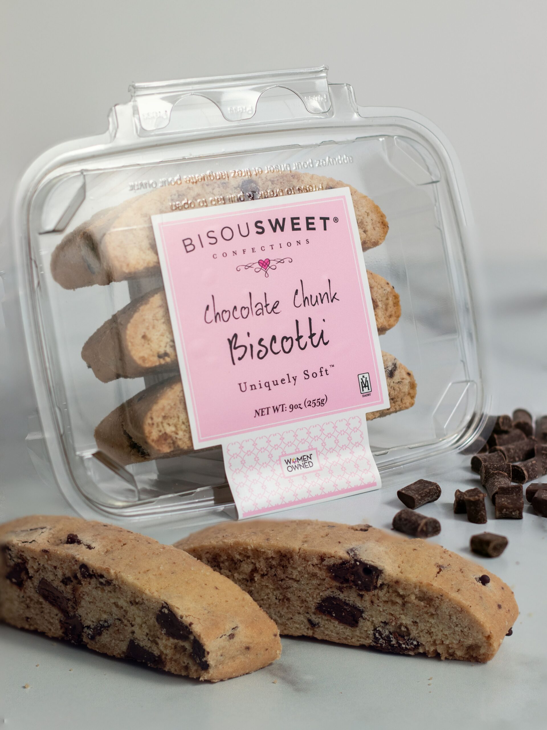 Our Uniquely Soft Biscotti is handcrafted with real ingredients and has a cookie-soft center. Bisousweet Chocolate Chunk Biscotti is a rich chocolate experience. Not too sweet, our chocolate chunk biscotti is studded with dark chocolate chunks. Perfect for everyday indulgence, our handcrafted biscotti is now available in a convenient clamshell container.